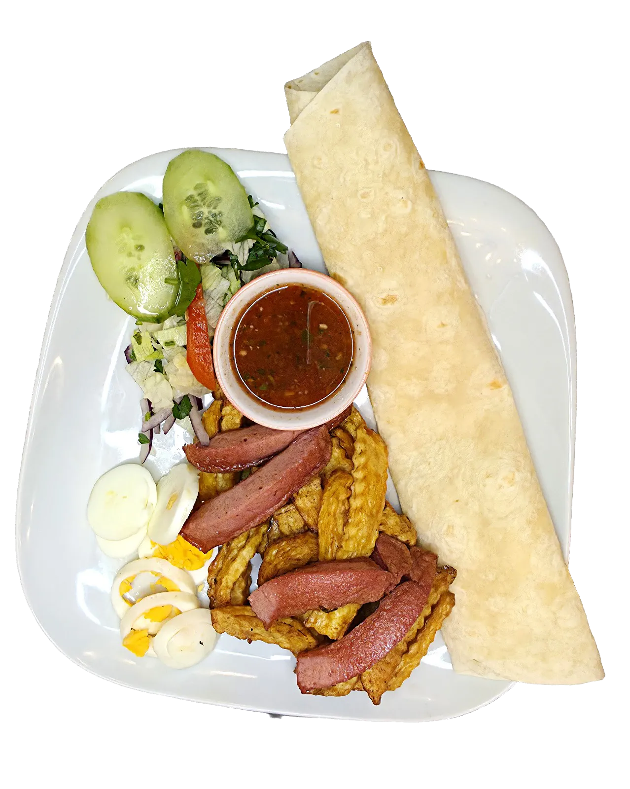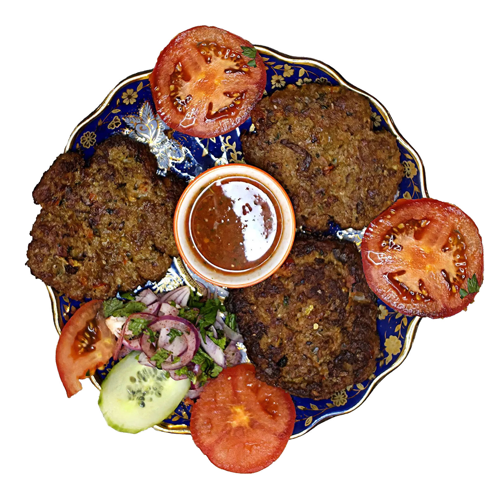 Traditionelle afghanische Spezialität: flache, würzige Fleischfrikadellen aus Rinderhackfleisch, Zwiebeln, Tomaten und frischen Kräutern, knusprig gebraten und mit Salat serviert.