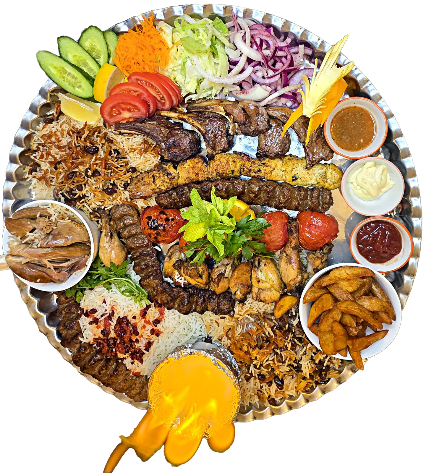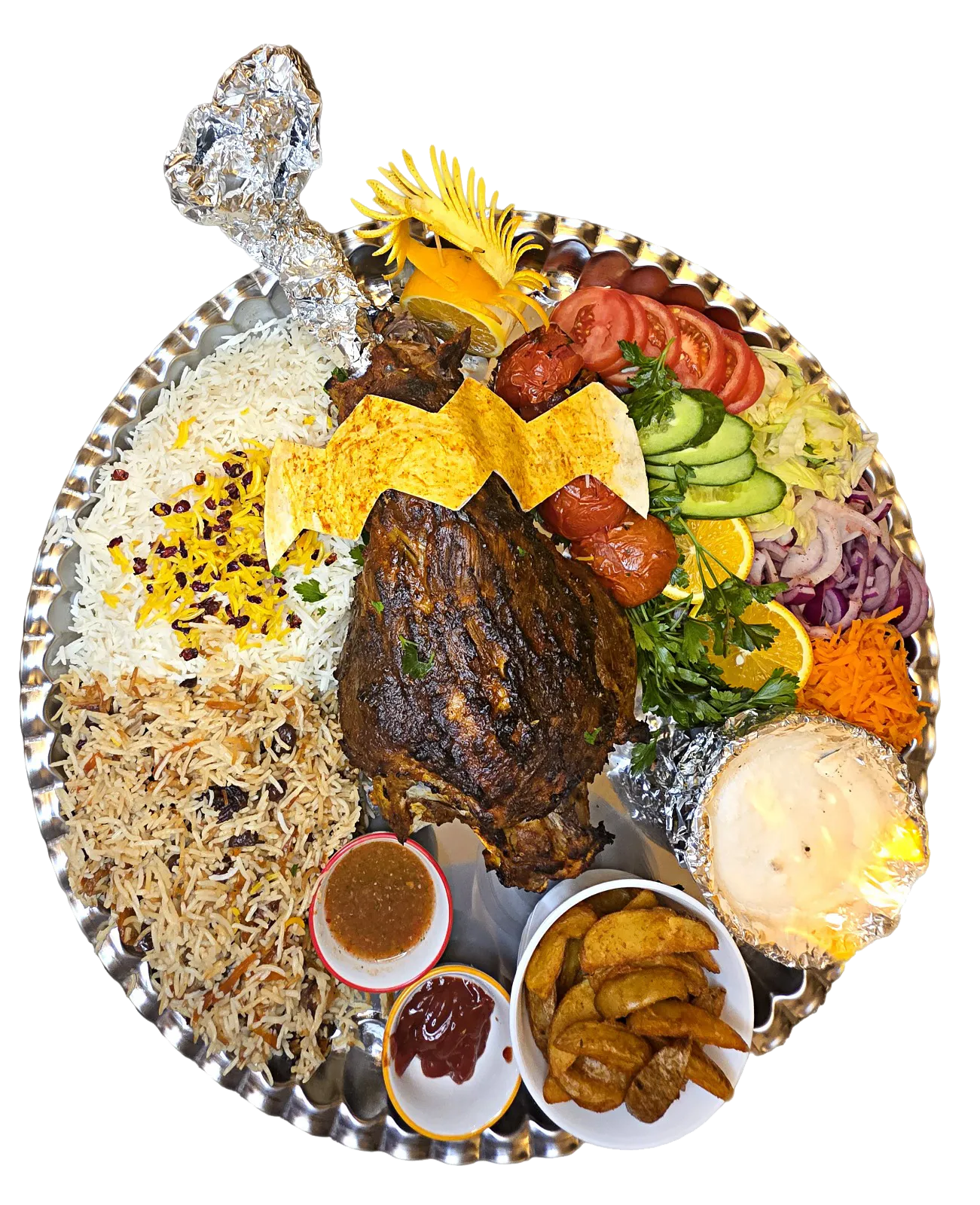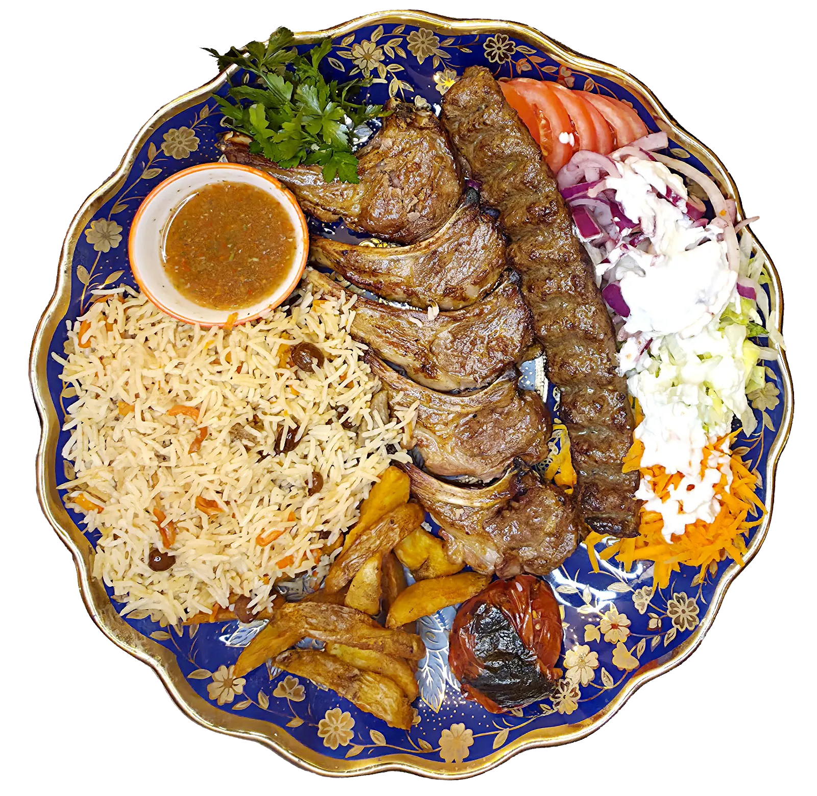 Traditionelles Qabili Palau mit gegrilltem Shishlik (Lammkoteletts) und einem Spieß koobideh (Rinderhackfleisch), serviert mit frischem Salat, gegrillter Tomate, Sauce und Beilagen.