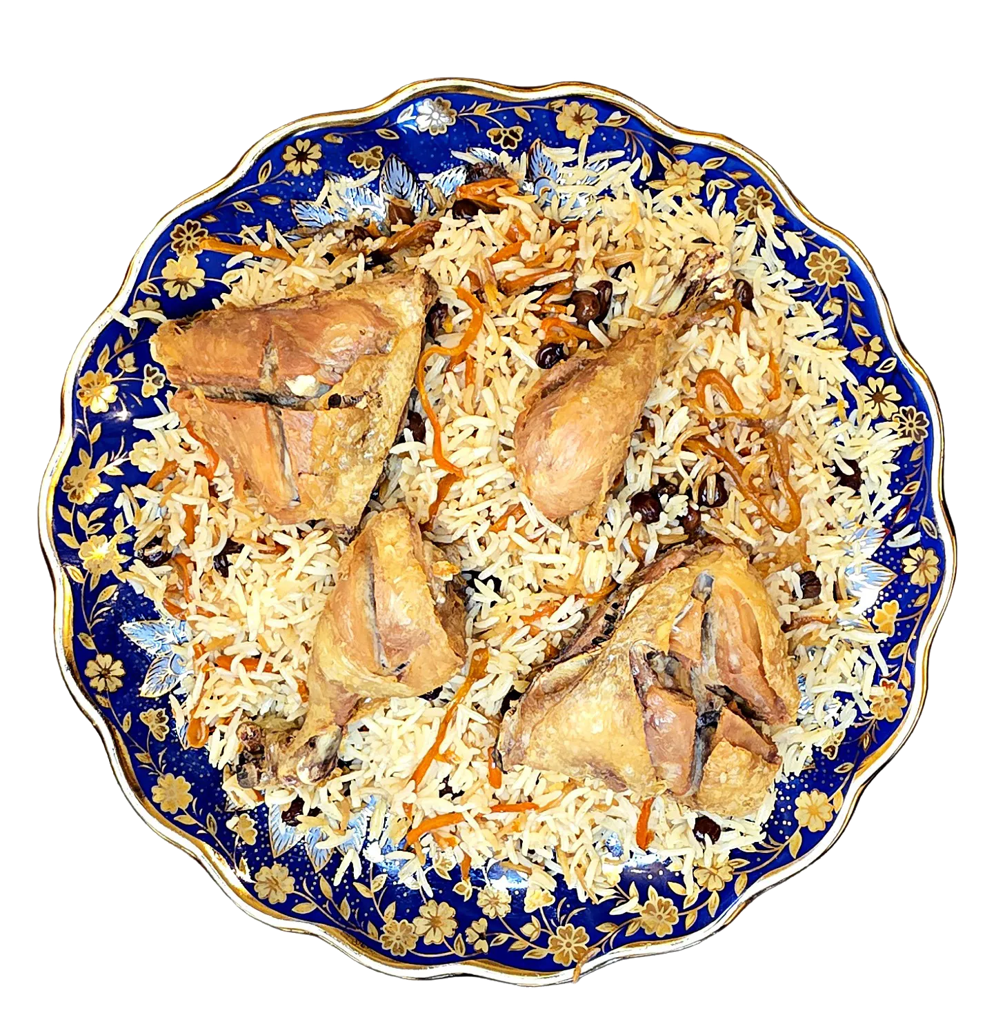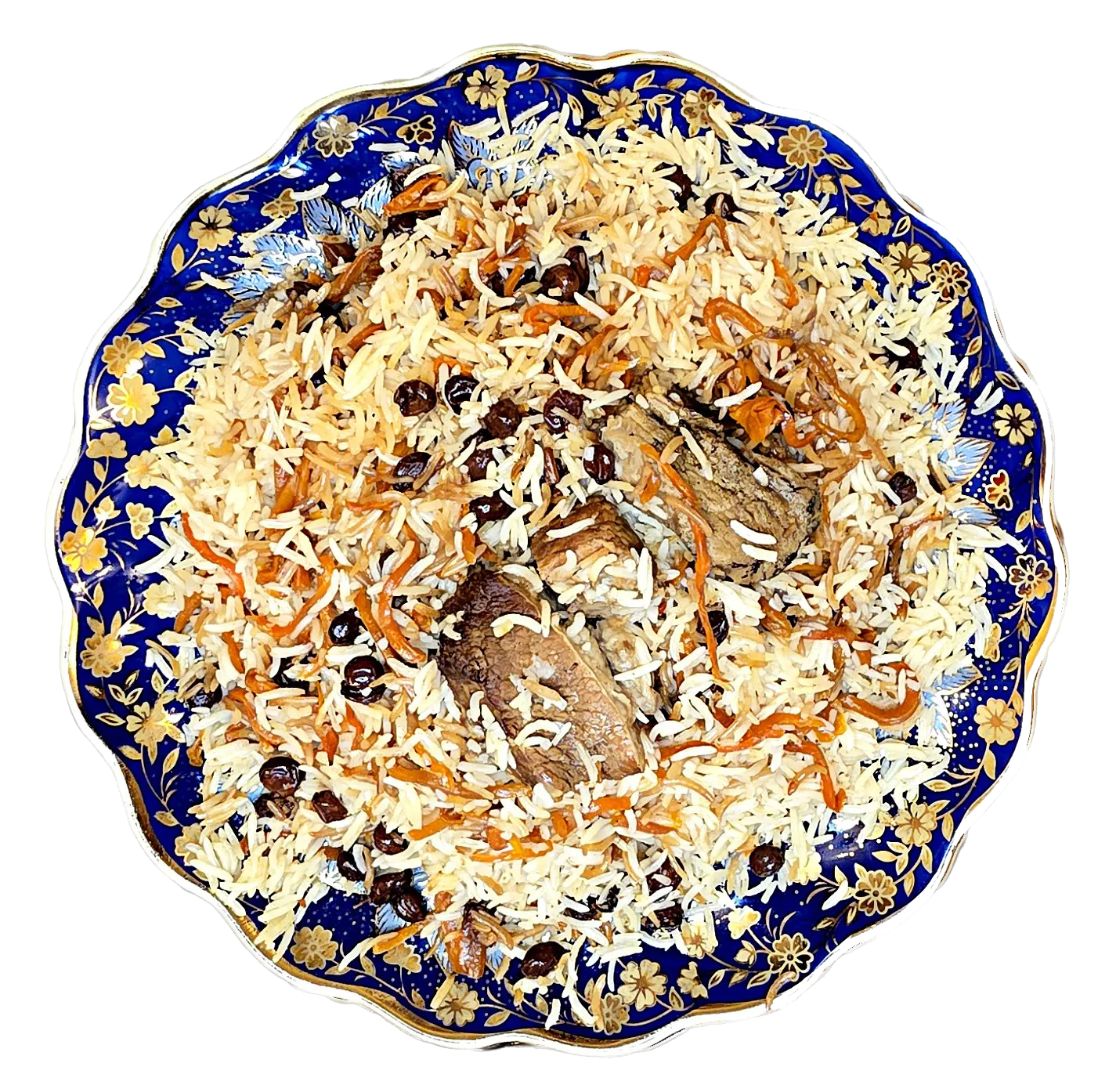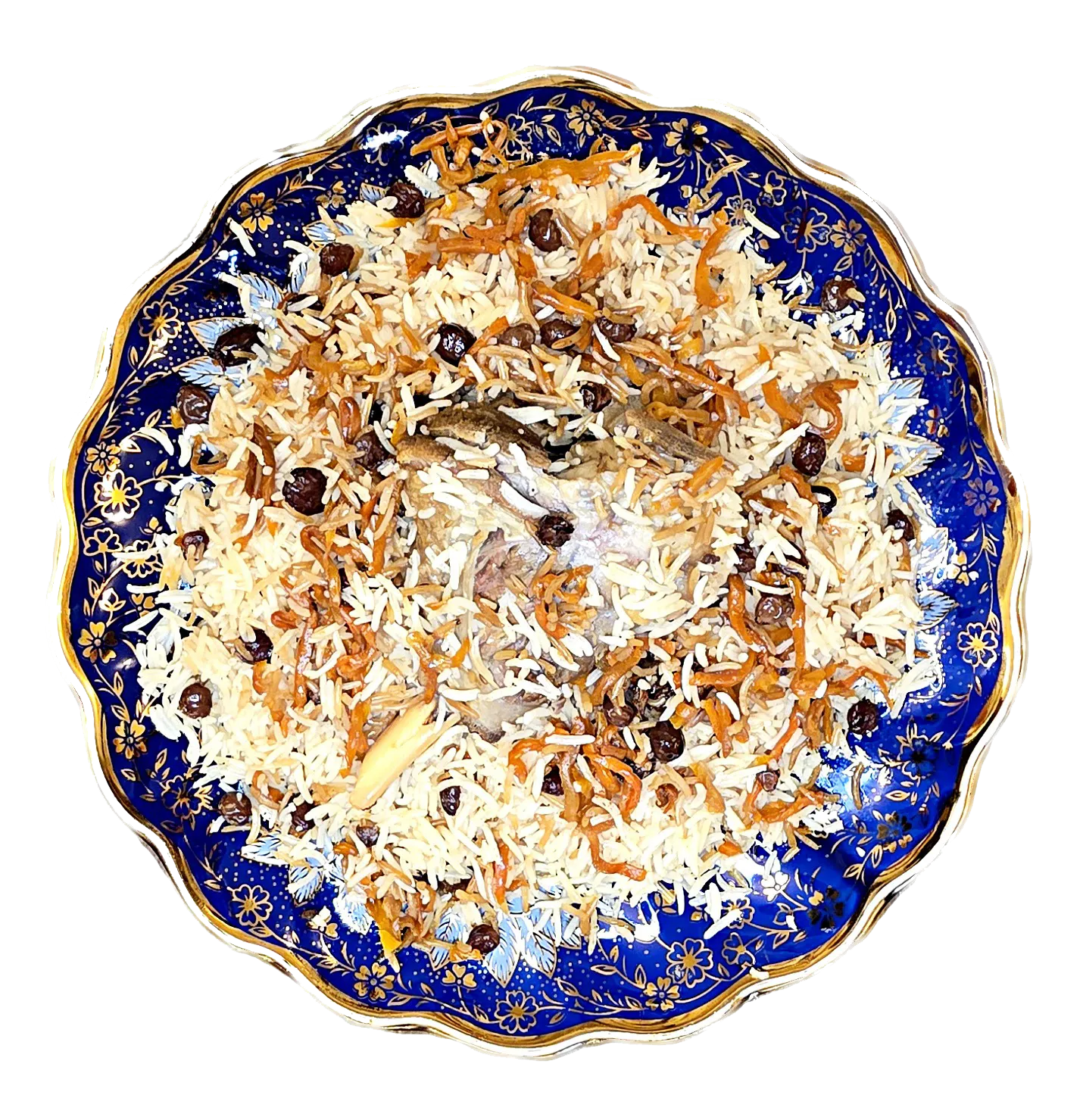 Traditionelles Qabili Palau mit gegrilltem Shishlik (Lammkoteletts) und einem Spieß koobideh (Rinderhackfleisch), serviert mit frischem Salat, gegrillter Tomate, Sauce und Beilagen.