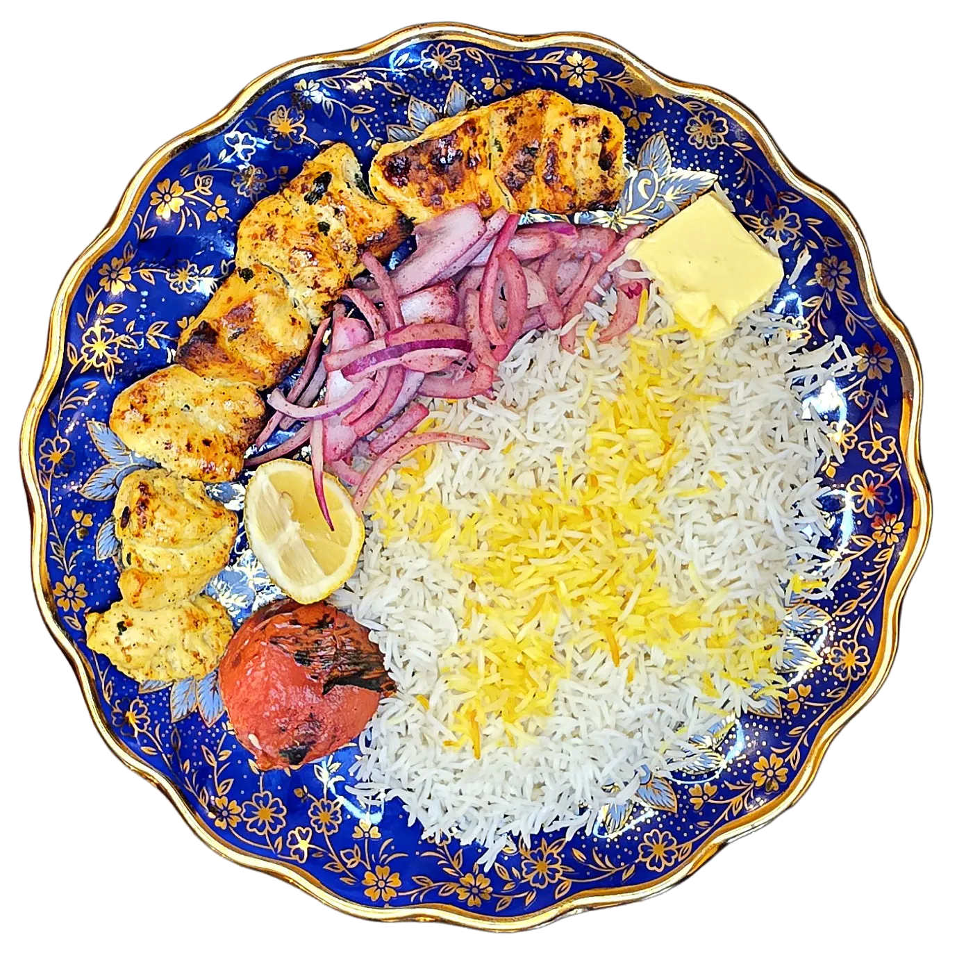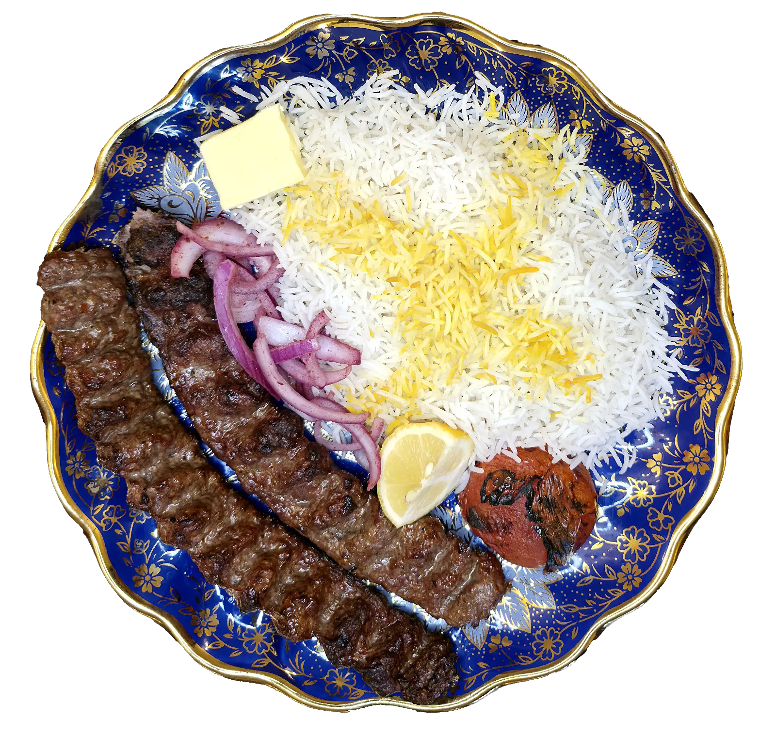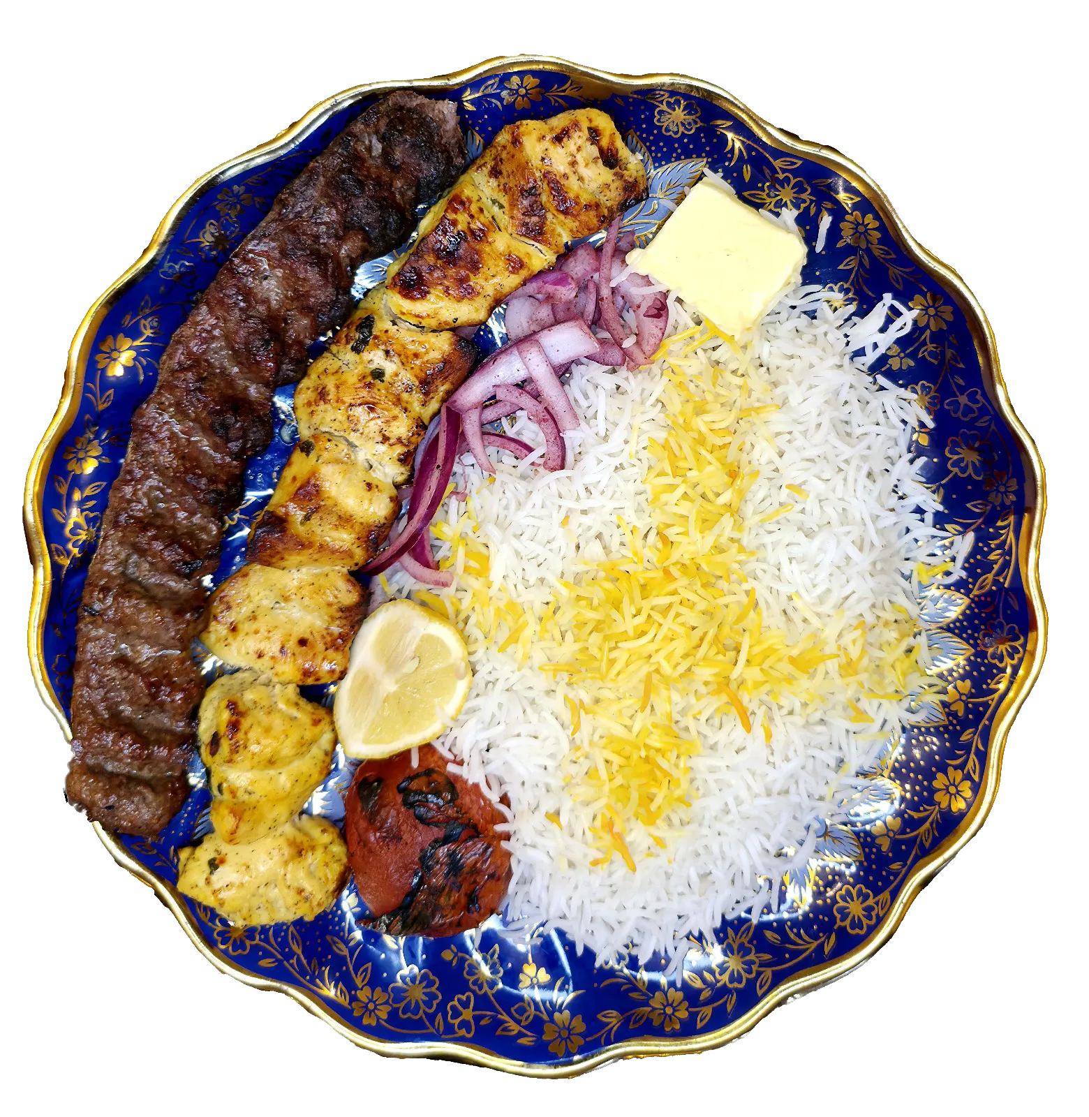 Ein Spieß saftiges Hähnchenfilet (Joojeh) und ein Spieß gegrilltes Hackfleisch (Koobideh), serviert mit duftendem Safranreis, gegrillter Tomate, Zwiebeln und Zitrone.