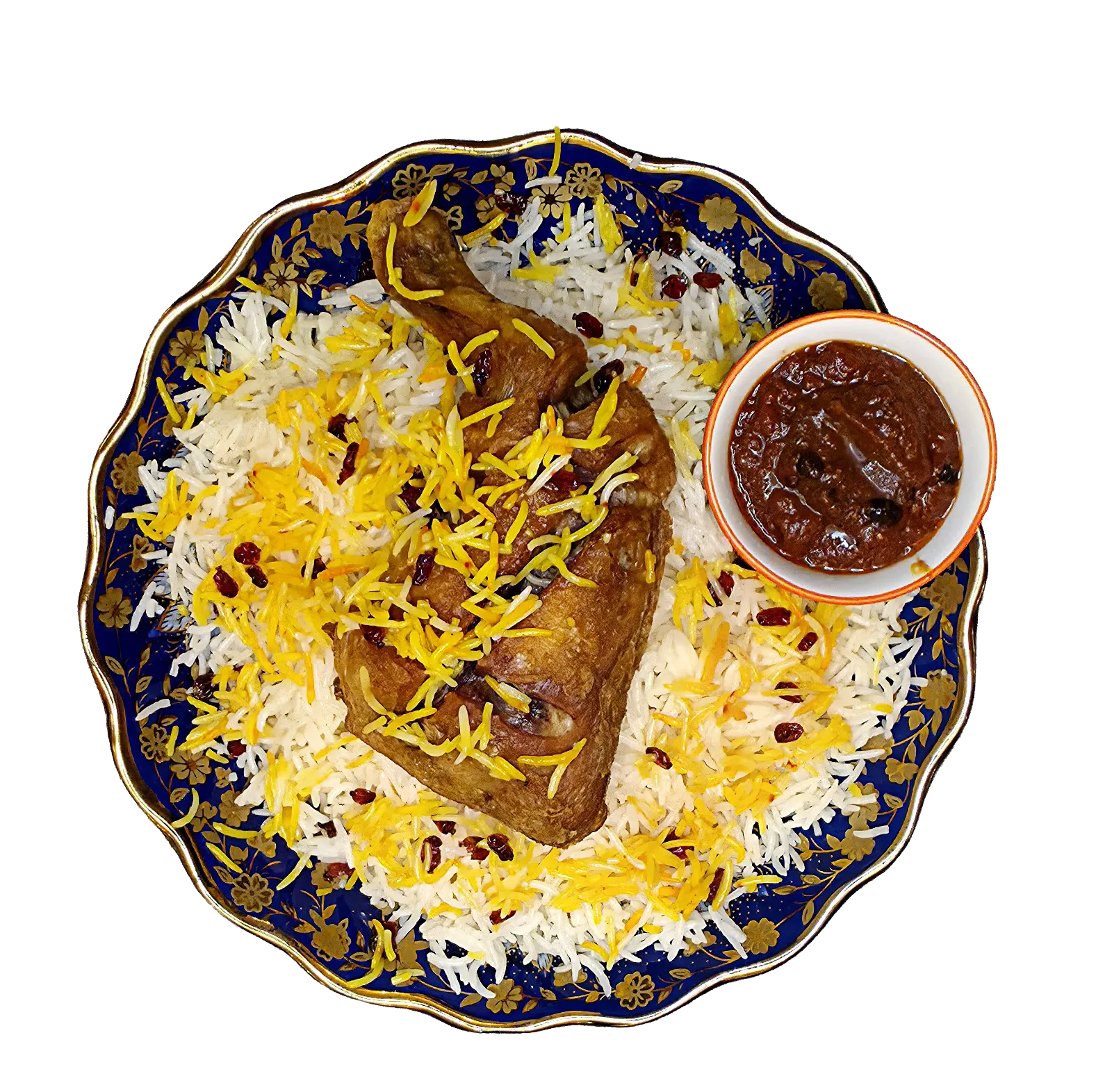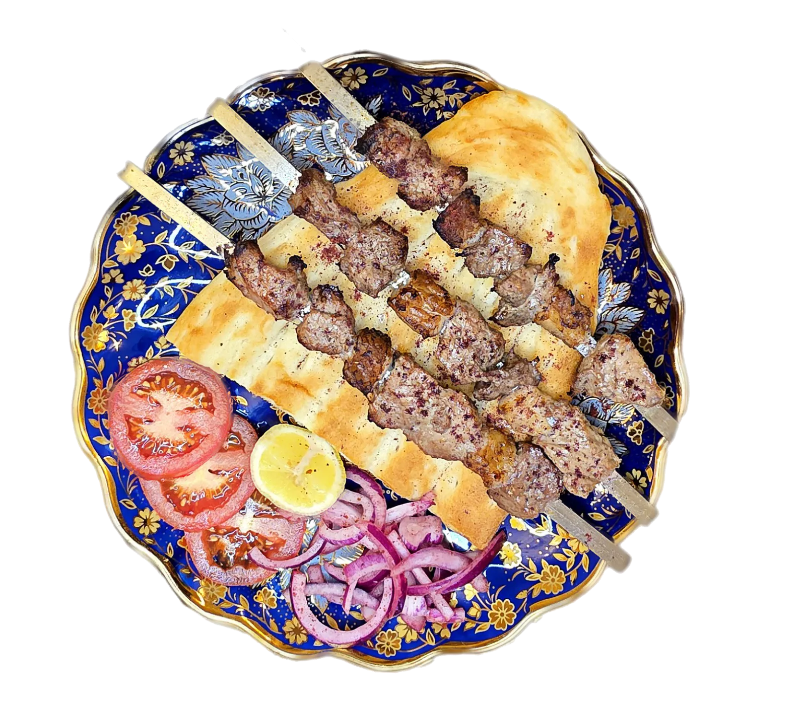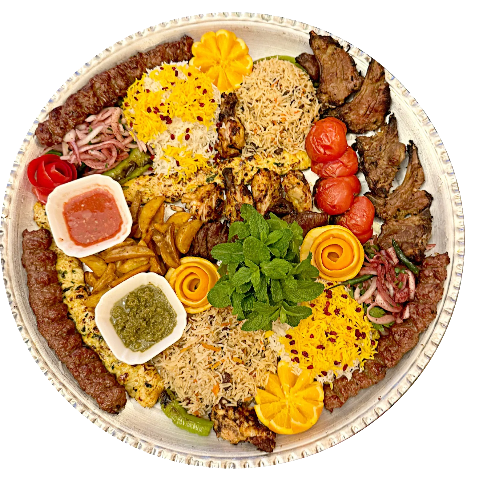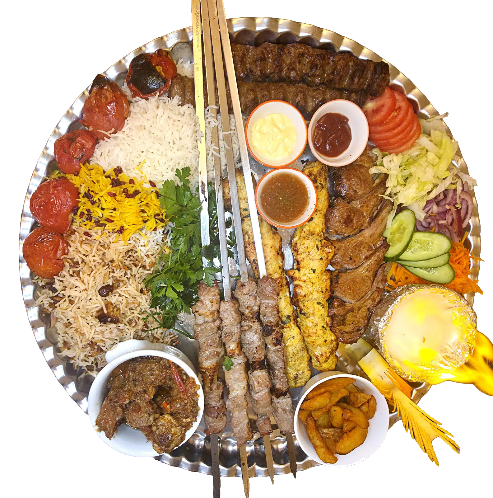 Ein Spieß saftiges Hähnchenfilet (Joojeh) und ein Spieß gegrilltes Hackfleisch (Koobideh), serviert mit duftendem Safranreis, gegrillter Tomate, Zwiebeln und Zitrone.