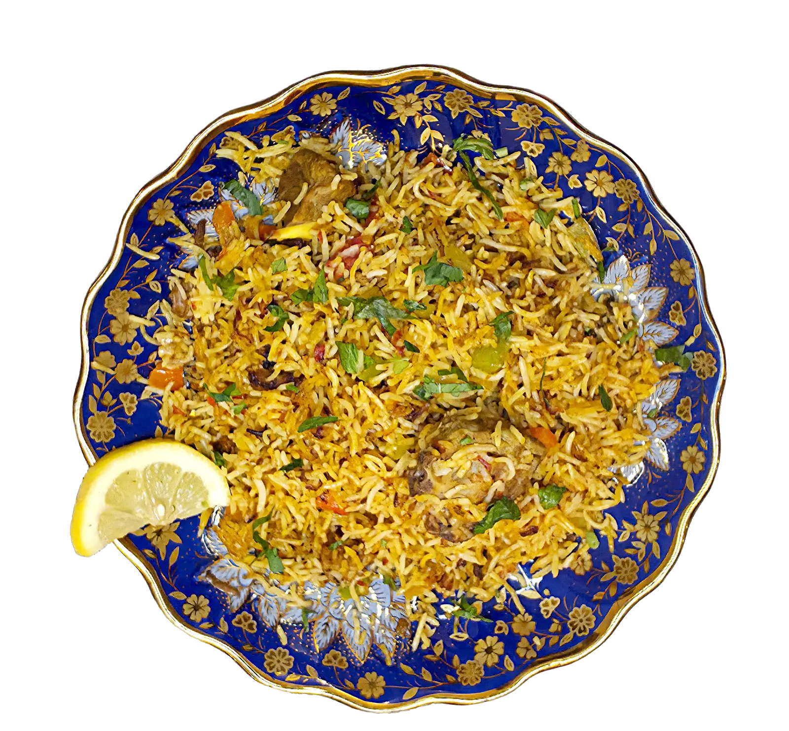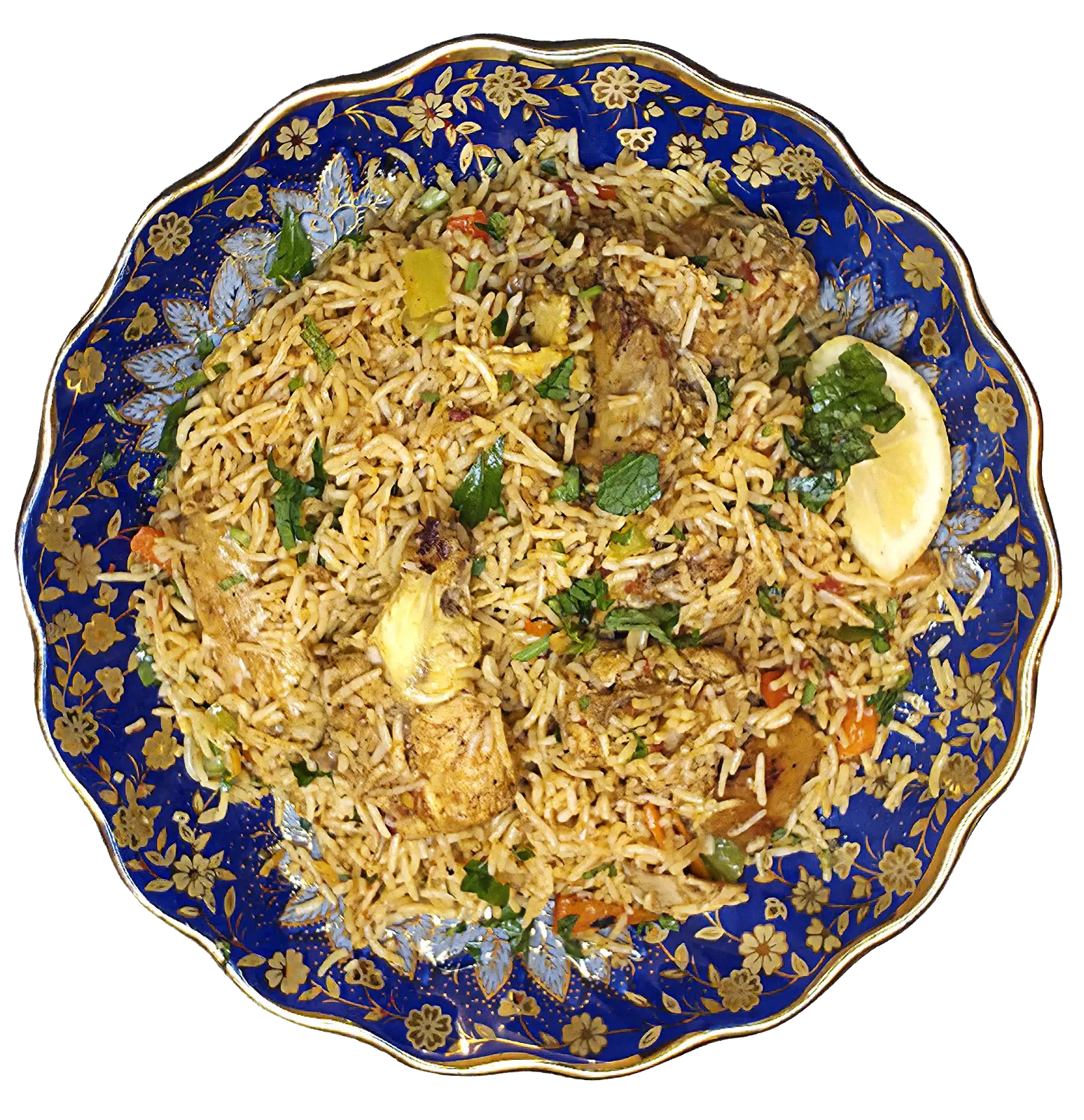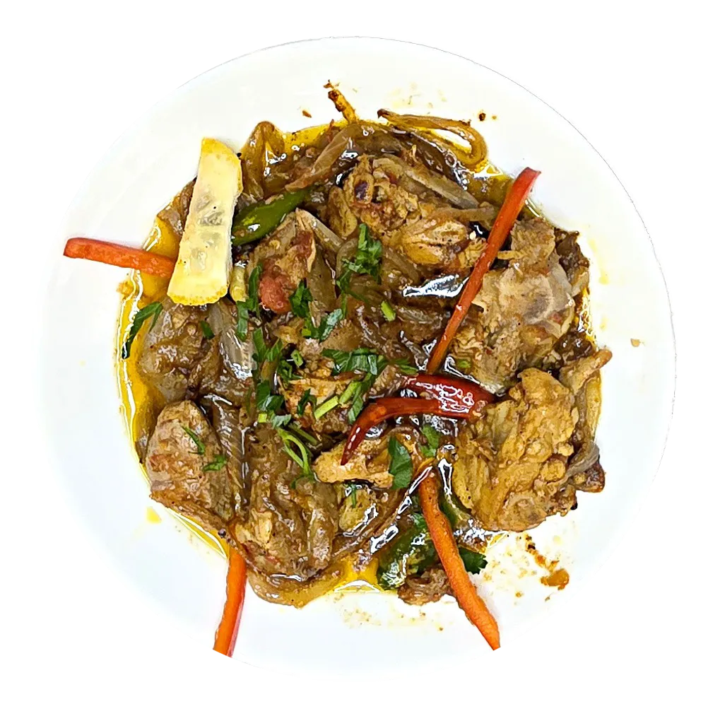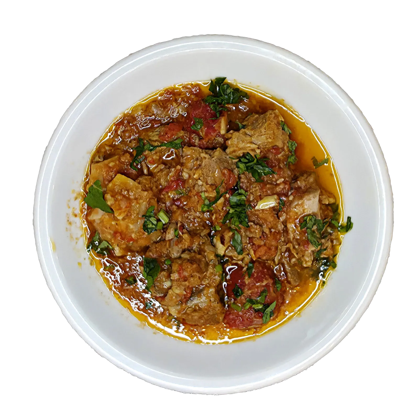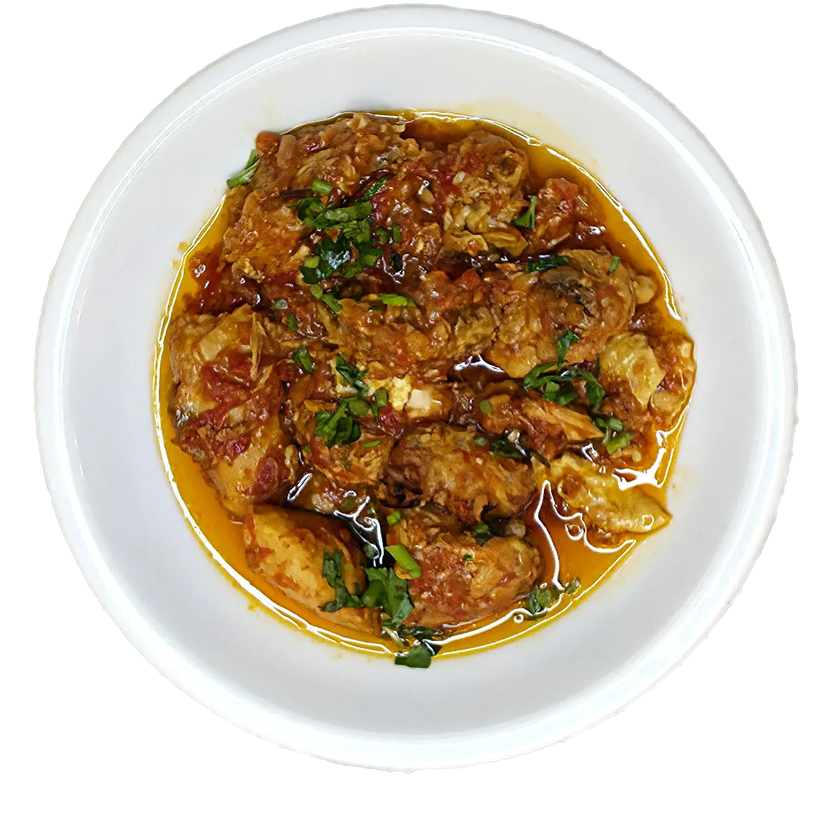 Traditionelles afghanisch-pakistanisches Gericht: Hähnchenstücke in einer würzigen Tomaten-Knoblauch-Sauce mit frischen Kräutern und aromatischen Gewürzen, serviert in