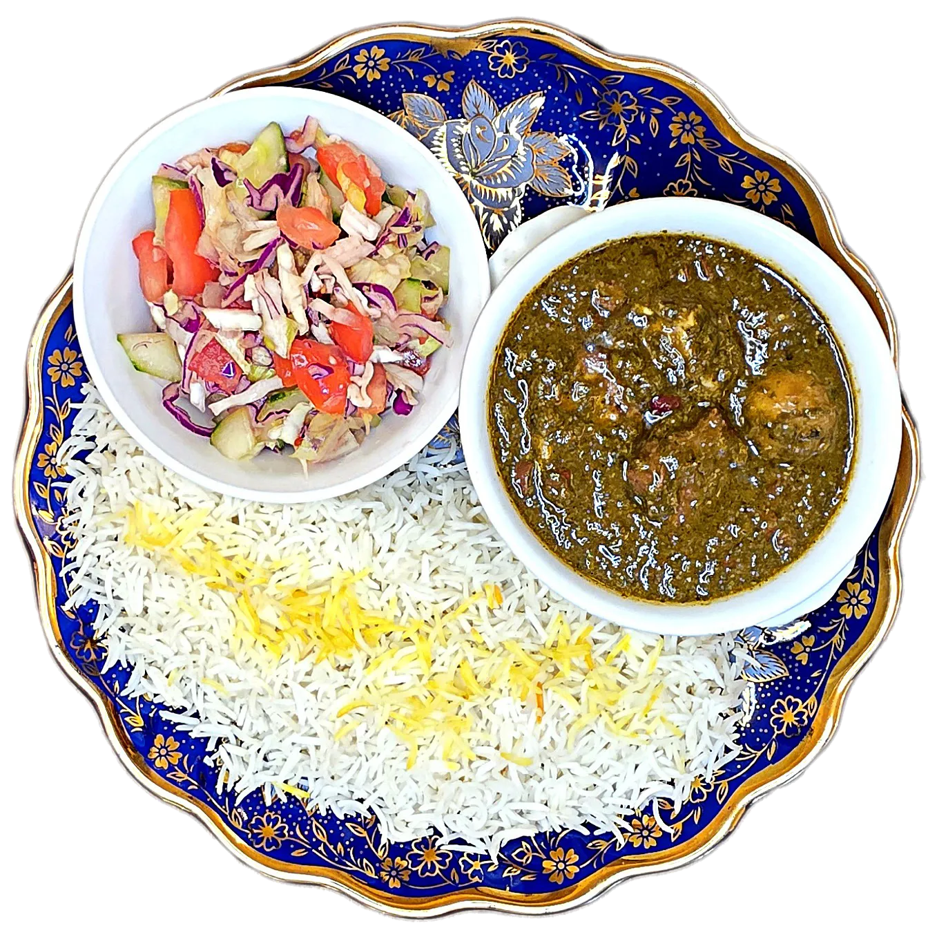 Traditionelles persisches Kräuter-Eintopfgericht mit Rindfleisch, Bohnen und getrockneten Limetten, serviert mit duftendem Safranreis und frischem Salat.