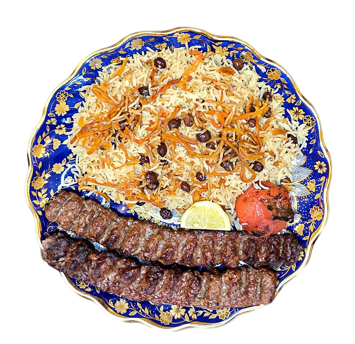 fghanisches Reisgericht mit Rosinen, Karottenstreifen und Mandeln, serviert mit zwei Spießen gegrilltem Rinder-Hackfleisch (Koobideh), gegrillter Tomate und Zitrone.