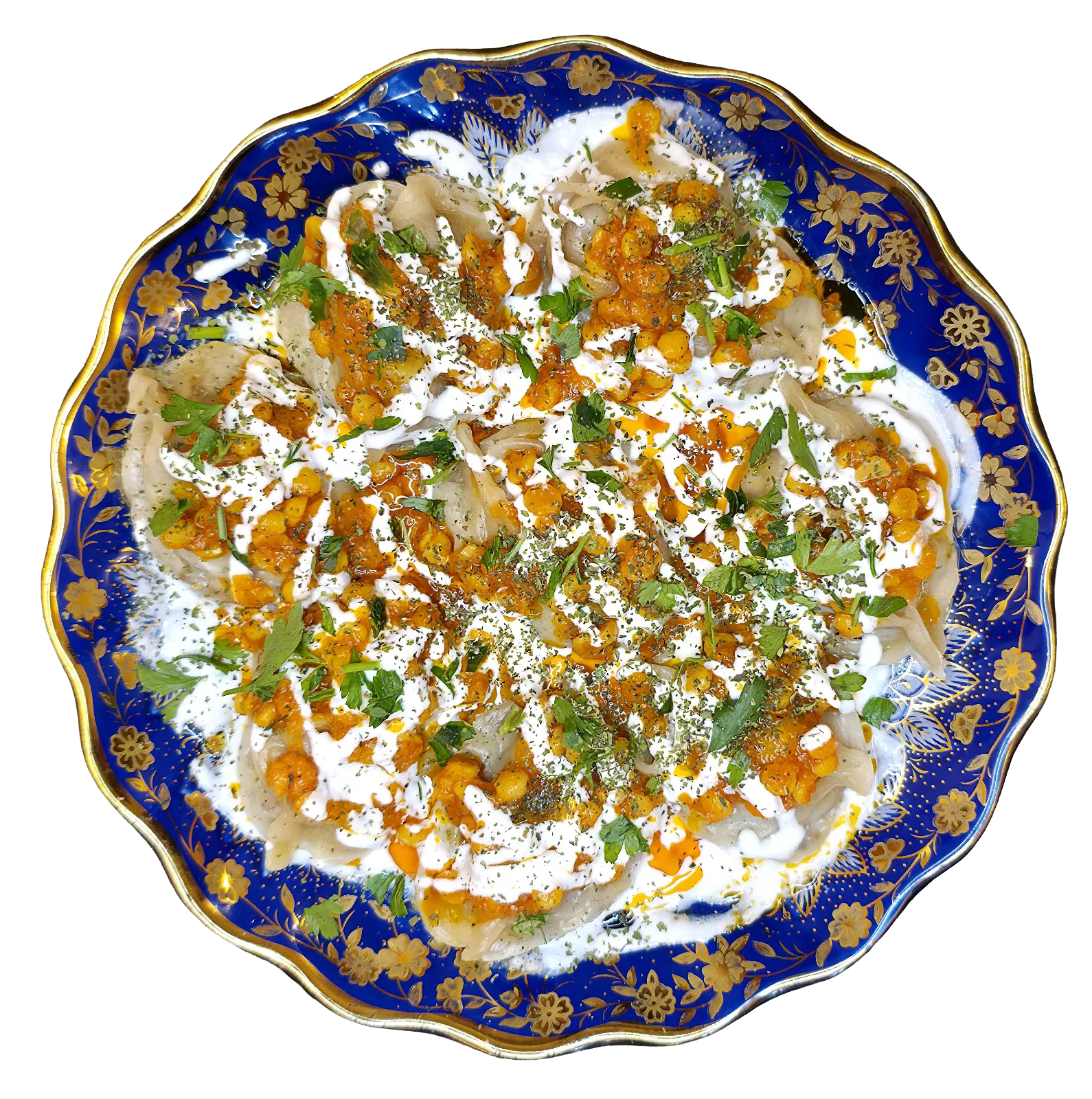 Traditionelle afghanische Teigtaschen, gefüllt mit Rinderhackfleisch und Zwiebeln, gedämpft und serviert mit Joghurt-Knoblauchsauce, Kichererbsen und frischen Kräutern.